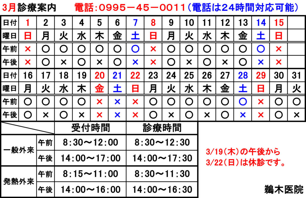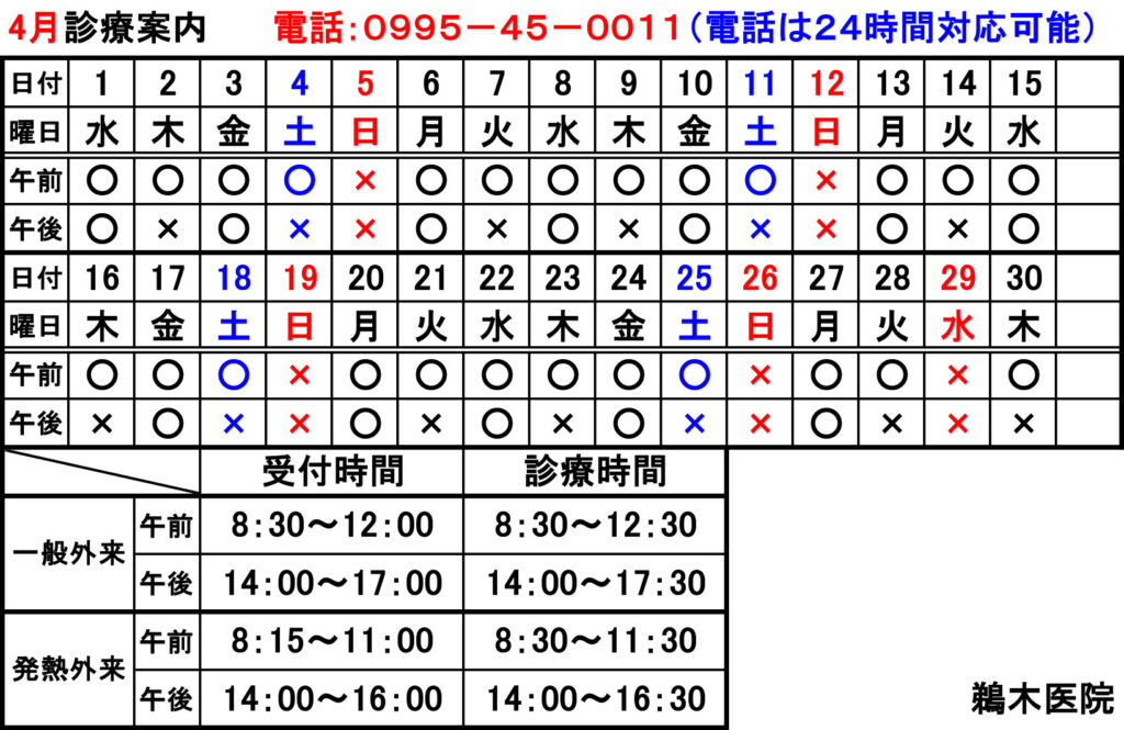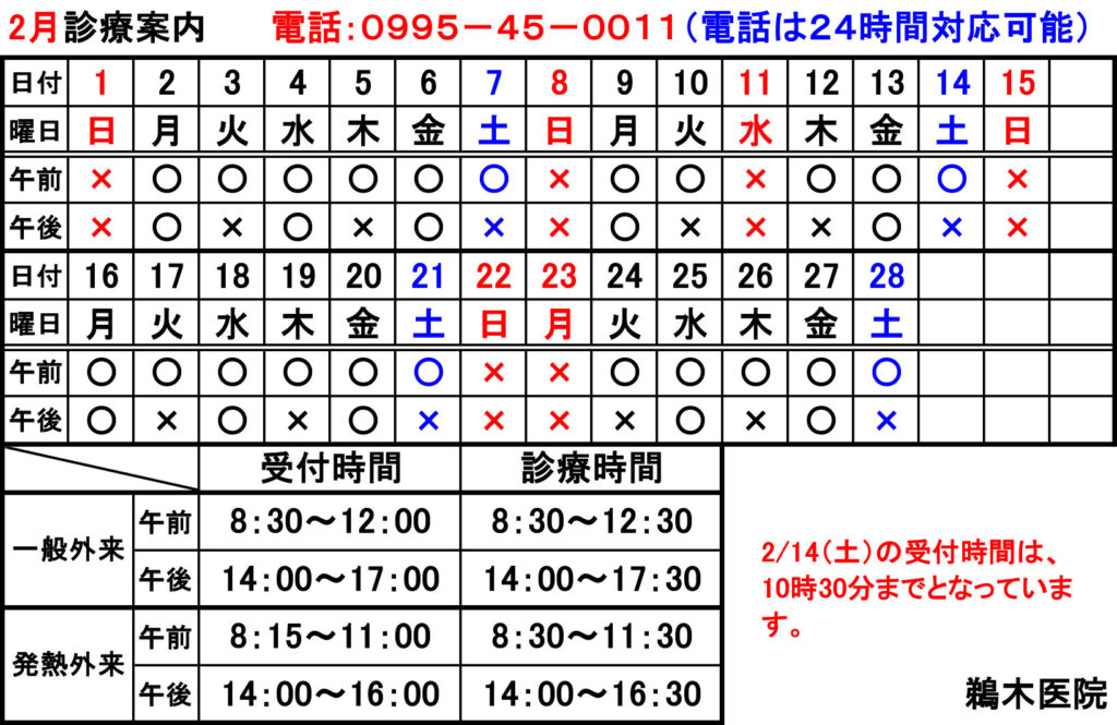令和8年2月〜令和8年4月の診療案内についてお知らせいたします。