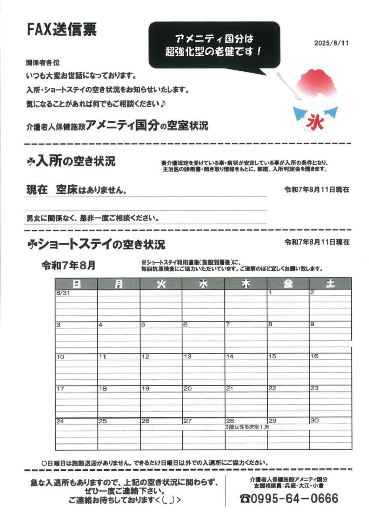 令和7年8月11日現在の入所・ショートステイの空き状況をお知らせいたします。