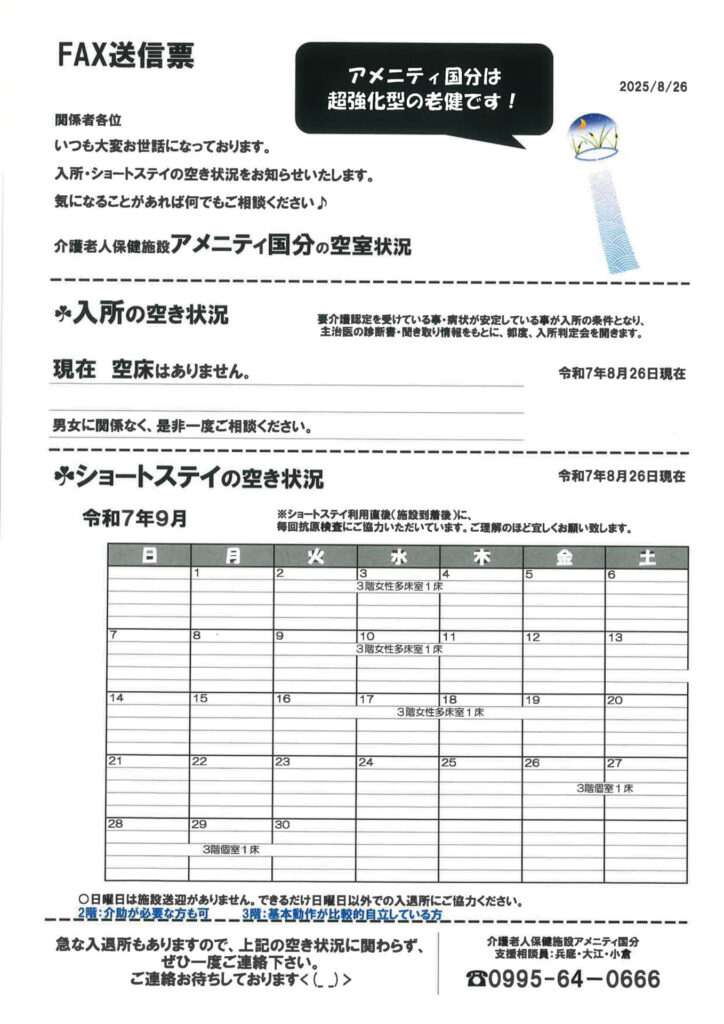 令和7年8月26日現在の入所・ショートステイの空き状況をお知らせいたします。