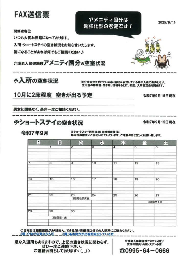 令和7年9月15日現在の入所・ショートステイの空き状況をお知らせいたします。