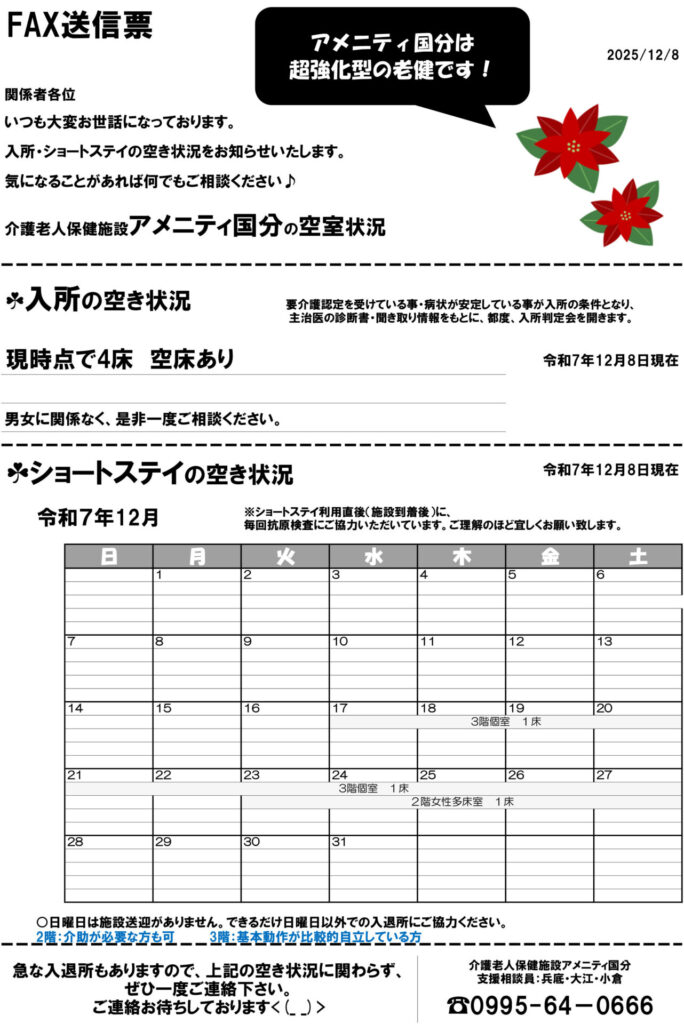令和7年12月8日現在の入所・ショートステイの空き状況をお知らせいたします。
