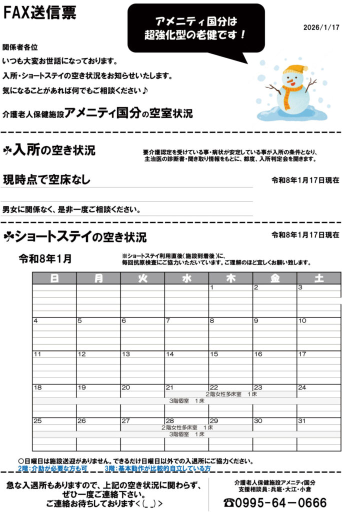 令和8年1月17日現在の入所・ショートステイの空き状況をお知らせいたします。
