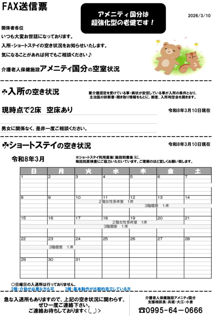 令和8年3月10日現在の入所・ショートステイの空き状況をお知らせいたします。